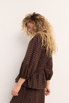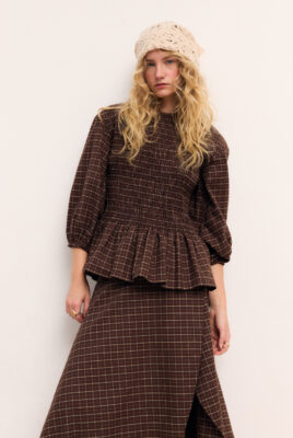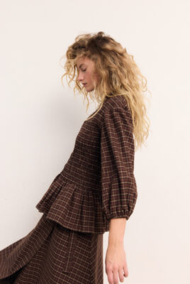 Model wyróżnia się efektownym marszczeniem na przodzie i w talii, które subtelnie podkreśla sylwetkę. Delikatna falbana dodaje jej lekkości i kobiecego charakteru, a ponadczasowy wzór w drobną kratę nadaje stylizacji eleganckiej, jesiennej harmonii. Proste rękawy zakończone dyskretnym ściągaczem dopełniają całość.