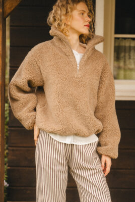 Obszerny golf zapinany na zamek pozwala regulować ciepło i dopasować styl – możesz nosić go zapiętego wysoko lub rozpiętego, tworząc luźny kołnierz. Ściągacz na dole subtelnie podkreśla sylwetkę i zapobiega podwiewaniu chłodnego powietrza, dzięki czemu bluza świetnie trzyma ciepło i zachowuje kształt. Rękawy zakończone gumką dodają wygody i lekkiego efektu balonu.