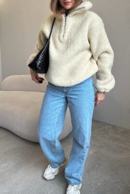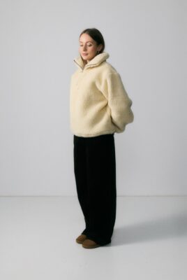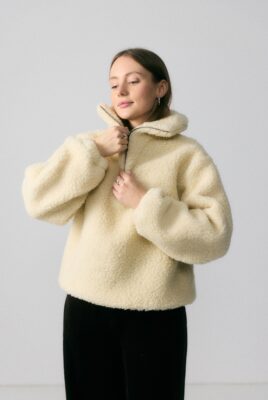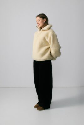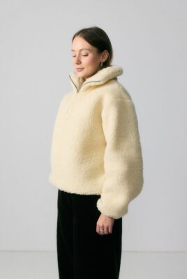 Obszerny golf zapinany na zamek pozwala regulować ciepło i dopasować styl – możesz nosić go zapiętego wysoko lub rozpiętego, tworząc luźny kołnierz. Ściągacz na dole subtelnie podkreśla sylwetkę i zapobiega podwiewaniu chłodnego powietrza, dzięki czemu bluza świetnie trzyma ciepło i zachowuje kształt. Rękawy zakończone gumką dodają wygody i lekkiego efektu balonu.