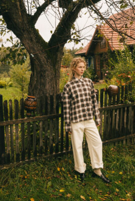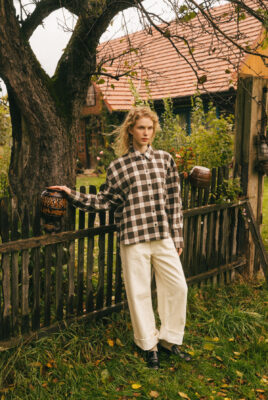Koszula Storm z certyfikowanej, kraciastej flaneli. Oversize’owy fason, dłuższy tył, kontrafałda na plecach i brązowe guziki – idealna na jesienne stylizacje.