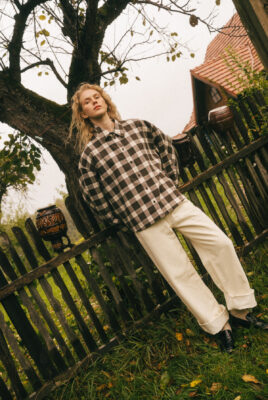 Koszula Storm z certyfikowanej, kraciastej flaneli. Oversize’owy fason, dłuższy tył, kontrafałda na plecach i brązowe guziki – idealna na jesienne stylizacje.
