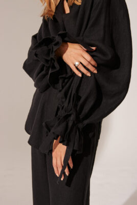 - efektowne rękawy z falbaną i wiązaniem na mankiecie