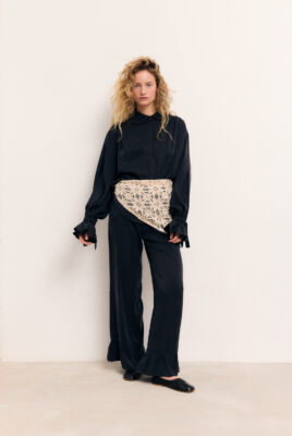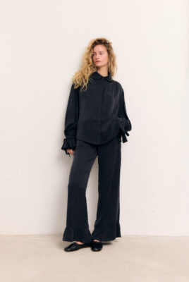 Spodnie Calais z najnowszej jesiennej kolekcji zostały uszyte z miękkiego, lejącego cupro, które pięknie układa się w ruchu. Elastyczna gumka w pasie gwarantuje wygodne dopasowanie, a ozdobne falbanki na dole nogawek dodają całości lekkości i kobiecego uroku. To idealny wybór na chłodniejsze dni – od miejskich spacerów po wieczorne wyjścia. Połącz je z koszulą Vieste i swoim ulubionym obuwiem, aby stworzyć pełną charakteru, jesienną stylizację.