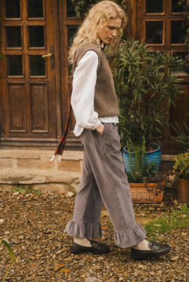 Sztruksowe spodnie Calais z najnowszej jesiennej kolekcji. Elastyczna gumka w pasie zapewnia idealne dopasowanie, a ozdobne falbanki na dole nogawek dodają im lekkości i elegancji. Staranne wykonanie oraz precyzyjne wykończenia czynią te spodnie doskonałym wyborem na każdą okazję od jesiennych spacerów po wieczorne wyjścia. Stwórz niezapomnianą stylizację, dopasowując je do swojego ulubionego obuwia!