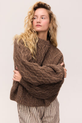 Gęsty, strukturalny splot otula i chroni przed chłodem, a luźny, lekko oversize’owy krój nadaje mu swobodny, rustykalny charakter. Ribowane wykończenia przy dekolcie, dole i mankietach podkreślają dopracowany fason i rękodzielniczy styl.