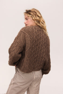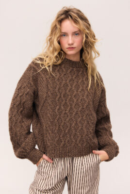 Sweter Aran – czekoladowy melanż o warkoczowym splocie.