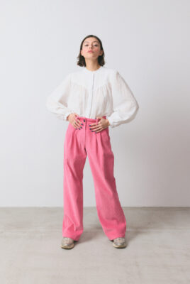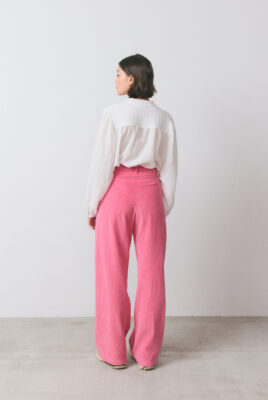 Spodnie Cordies w kolorze różowym o długiej, szerokiej nogawce wykonane są z miękkiego sztruksu z aksamitnym wykończeniem. Spodnie posiadają luźny krój, wysoki stan oraz ozdobne zakładki. Po bokach dodałyśmy kieszenie, aby model był wygodny i praktyczny. Zapięcie na guzik zapewni idealne dopasowanie i podkreśli Twoją talię. Połącz w komplecie z ulubioną koszulą Vieste lub Bebe.
