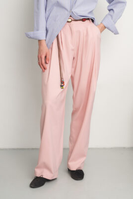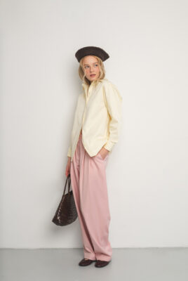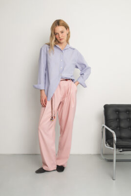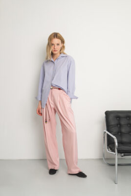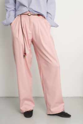 Spodnie Friday to esencja swobodnej elegancji i nowoczesnej formy. Wykonane z mięsistej wiskozy w kolorze pudrowego różu, która miękko układa się na sylwetce i płynnie pracuje w ruchu, nadając całości lekkości i naturalnej dynamiki.