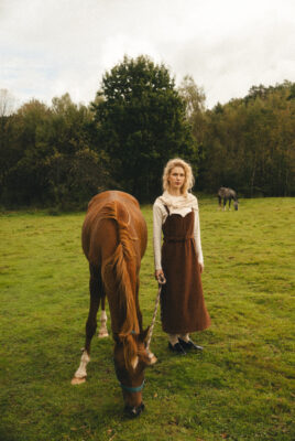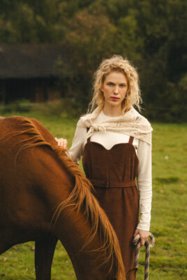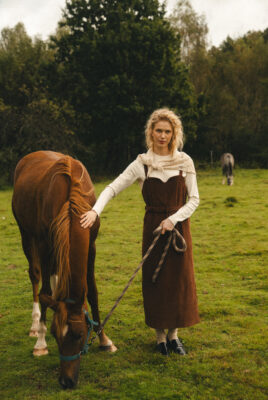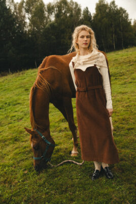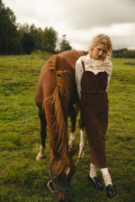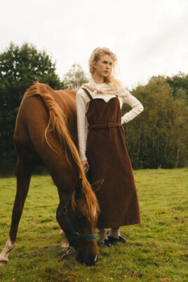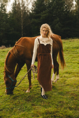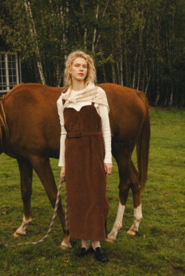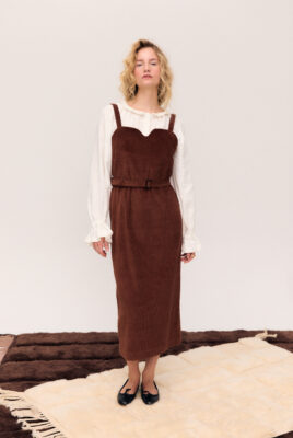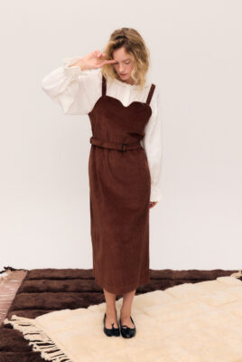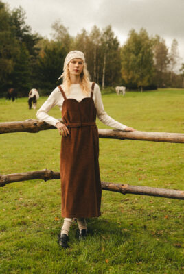 Sukienka ogrodniczka w odcieniu ciepłego brązu, uszyta ze 100% certyfikowanego sztruksu Oeko-Tex – tkaniny naturalnej, mięsistej i przyjemnej w dotyku, bezpiecznej dla skóry i środowiska.