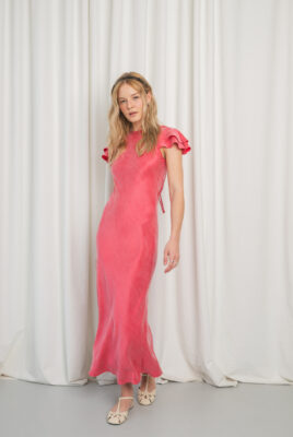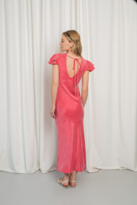 Klasyczny fason midi został urozmaicony podwójnymi falbanami przy rękawkach oraz głębokim wycięciem na plecach, subtelnie wiązanym na cienki pasek. Ten kobiecy detal dodaje uroku i lekkości, tworząc z sukienki June idealny wybór na letnie dni, garden party, wakacyjne spacery czy wieczorne spotkania.
