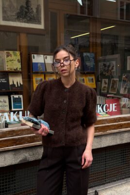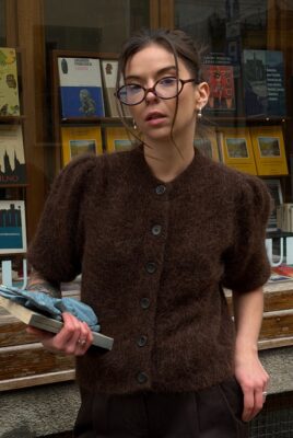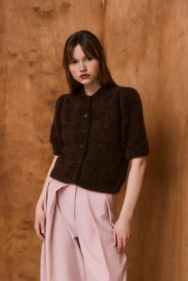 Model posiada krótki, lekko bufisty rękaw oraz subtelne guziki z przodu, które podkreślają jego kobiecy i ponadczasowy charakter. Delikatna, puszysta struktura jest przyjemna dla skóry i nie sypie się, dzięki czemu kardigan zachowuje piękny wygląd przez długi czas.