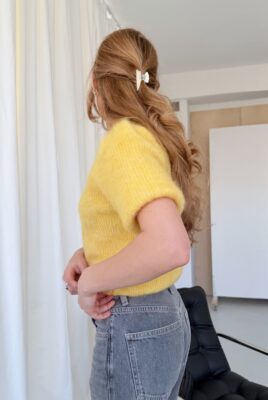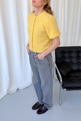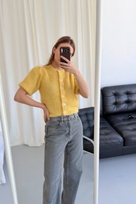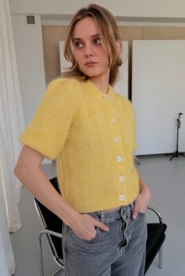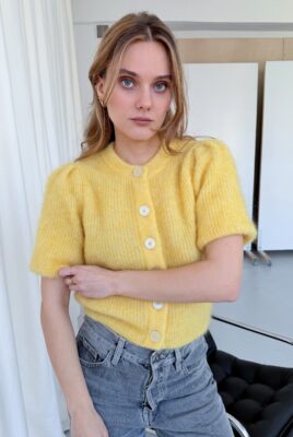 Sweterek Camille z krótkim rękawem w cytrynowo-masełkowym, żółtym kolorze. Miękki moher z alpaką, subtelne guziki i kobiecy krój inspirowany stylem paryżanek.