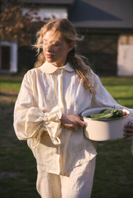 - efektowne rękawy z falbaną i wiązaniem na mankiecie