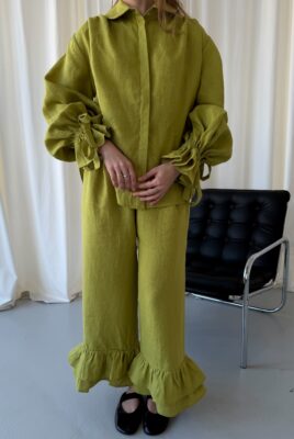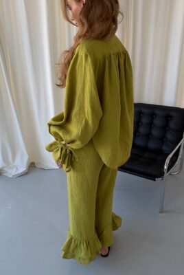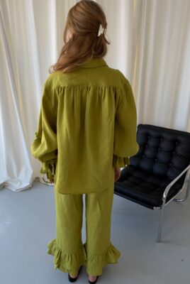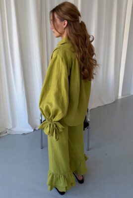 Odkryj koszulę Vieste w wyjątkowym kolorze matcha. Ten model z długimi rękawami i eleganckimi falbanami to połączenie kobiecego stylu i swobodnej elegancji. Wykonana w 100% z lnu, jest lekka, przewiewna i niezwykle przyjemna w noszeniu, dzięki czemu doskonale sprawdzi się w cieplejsze, wiosenne dni.