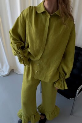 Odkryj koszulę Vieste w wyjątkowym kolorze matcha. Ten model z długimi rękawami i eleganckimi falbanami to połączenie kobiecego stylu i swobodnej elegancji. Wykonana w 100% z lnu, jest lekka, przewiewna i niezwykle przyjemna w noszeniu, dzięki czemu doskonale sprawdzi się w cieplejsze, wiosenne dni.