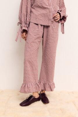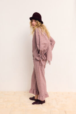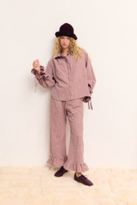 Spodnie Calais z najnowszej jesiennej kolekcji wykonane są z miękkiej, miłej bawełny w najmodniejszą kratę tego sezonu w odcieniach fioletu i brązu. Elastyczna gumka w pasie gwarantuje idealne dopasowanie, a praktyczne boczne kieszenie zwiększają funkcjonalność.